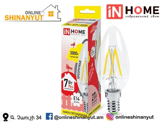 LED լամպ մոմ-deco թափանցիկ 7վտ E14 3000K IN HOME
